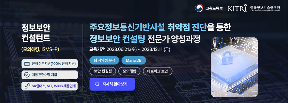 | <모집마감>__(컨설팅3기) 주요정보통신기반시설 취약점 진단을 통한 정보보안 컨설팅 전문가 양성과정 (0) | 2023.05.03 |