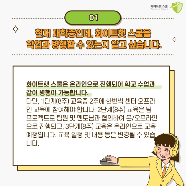 화이트햇 스쿨 사무국으로 연락주세요! 빠르고 정확하게 도움 드리겠습니다 🙆💚