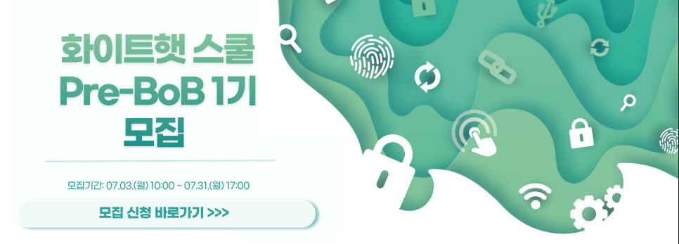 | [1기] 화이트햇 스쿨(Pre-BoB) 1기 모집설명회 (0) | 2023.07.14 |