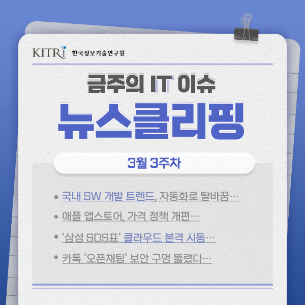 ▶ 기사 출처: ※ 오현식, "“국내 SW 개발 트렌드, 자동화로 탈바꿈”", IT비즈, 2023-03-13, https://www.itbiznews.com/news/articleView.html?idxno=92713 ※ 왕진화, "애플 앱스토어, 韓 모든 앱에 글로벌 가격 책정 방식 적용 시작", 디지털데일리, 2023-03-13, https://www.ddaily.co.kr/news/article/?no=259202 ※ 김가은, "'삼성SDS표' 클라우드 본격 시동…"통합 브랜드·HPC데이터센터로 韓 기업 시장 평정한다"", 테크엠, 2023-03-12, https://www.techm.kr/news/articleView.html?idxno=107817 ※ 이형두, "카톡 '오픈채팅' 보안..